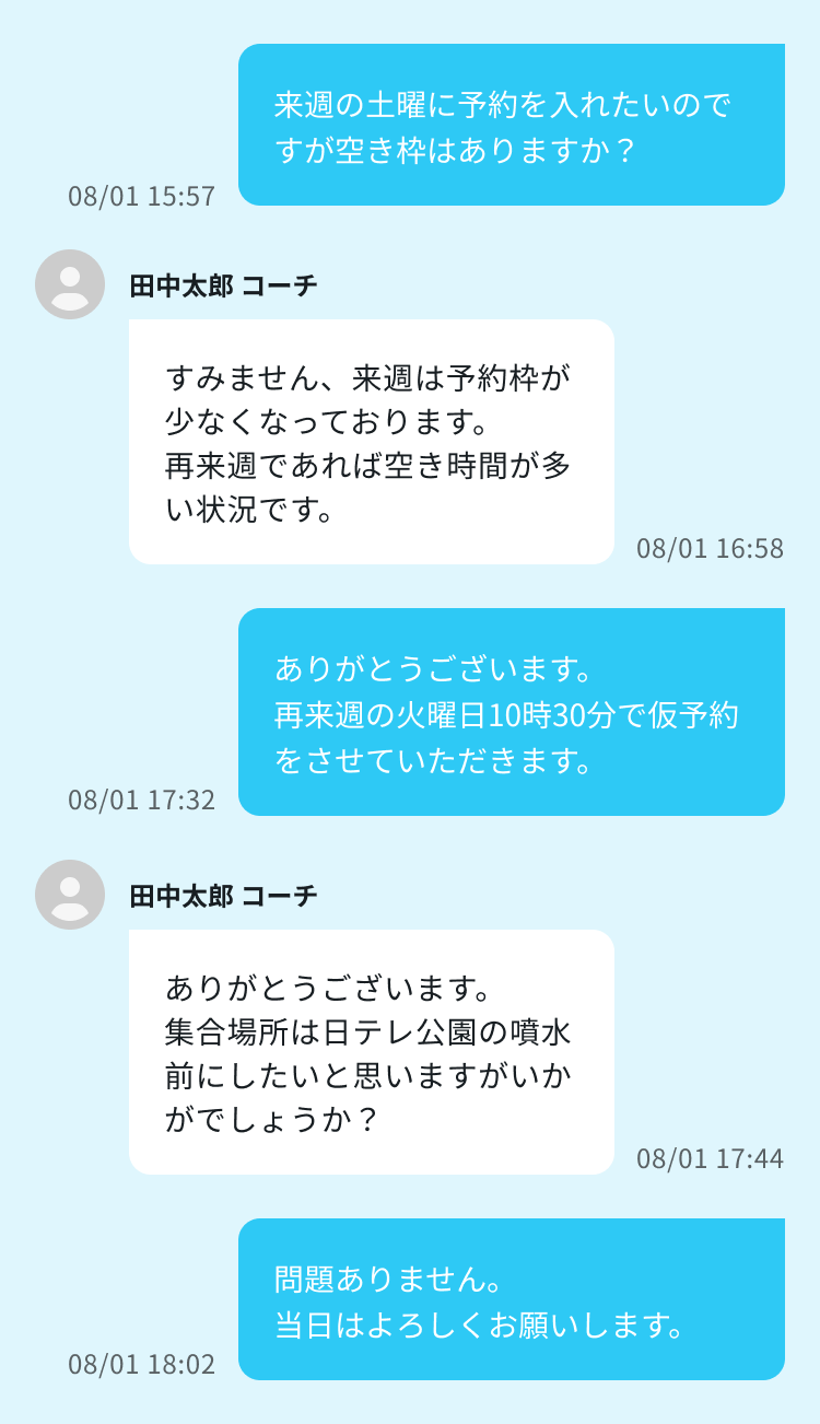 ※この時点ではまだ予約は成立しておりません36時間以内にコーチからトレーニング料金が提示されます