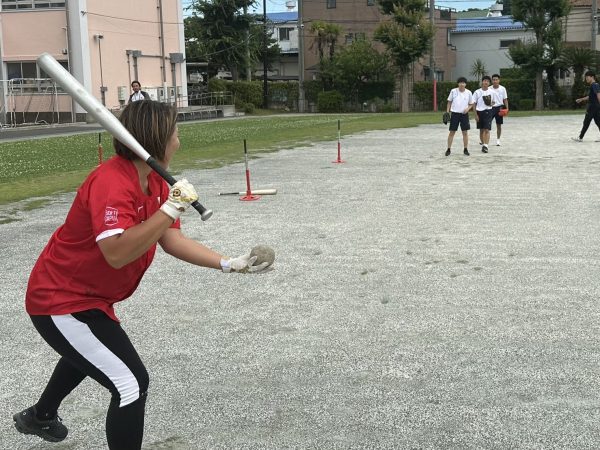 そしてボールを使った実技授業へ。「キャッチボールはコミュニケーションが大事。声を出していこう!」と伝える三科さん。さらに「体が緊張すると力が発揮できないから“ニヤニヤ”しながら力を抜いて楽しもう!」とアドバイス。すると一気に生徒たちに笑顔と歓声が生まれました。体育館でしっかり体をあたため、次はバッティング練習でグラウンドへ。