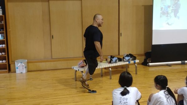 なんと、最初はご自身が飼っている猫の話から。実は樋口さん、普段は小学校の理科の先生もされているので、アイスブレイクを使い、全く違う話から生徒達の緊張をゆっくりほぐしていきます。そして、大好きなナマズ釣りの話や、ご自身が脚を無くしてしまった原因をQ&Aにし、1、交通事故、2、病気、3、ウサギに食べられた等々、生徒達の表情にも変化が見られます。因みにこの質問、手を挙げた人数はほぼ三等分していました!