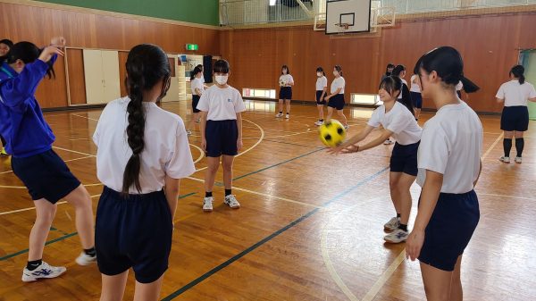 生徒たちが一生懸命、パスをつないでいるところへボールを追加。こちらは手で投げる、ということで足と手でのパス回し。あちらこちらでボールが飛び交い、なかなかうまくつなぐことができません。