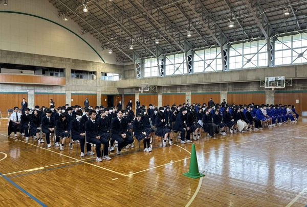 前半の講話の授業は、1年生と2年生の参加です。開始時間前に静かに待つ生徒たち。