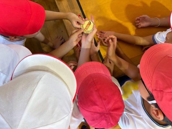 講話後に荒牧選手がポケットから取り出したメダル。休憩中、本物のメダルに目を輝かせ、手で触れたり首にかけたりしながら、その重みと輝きを実感して大はしゃぎしていました。