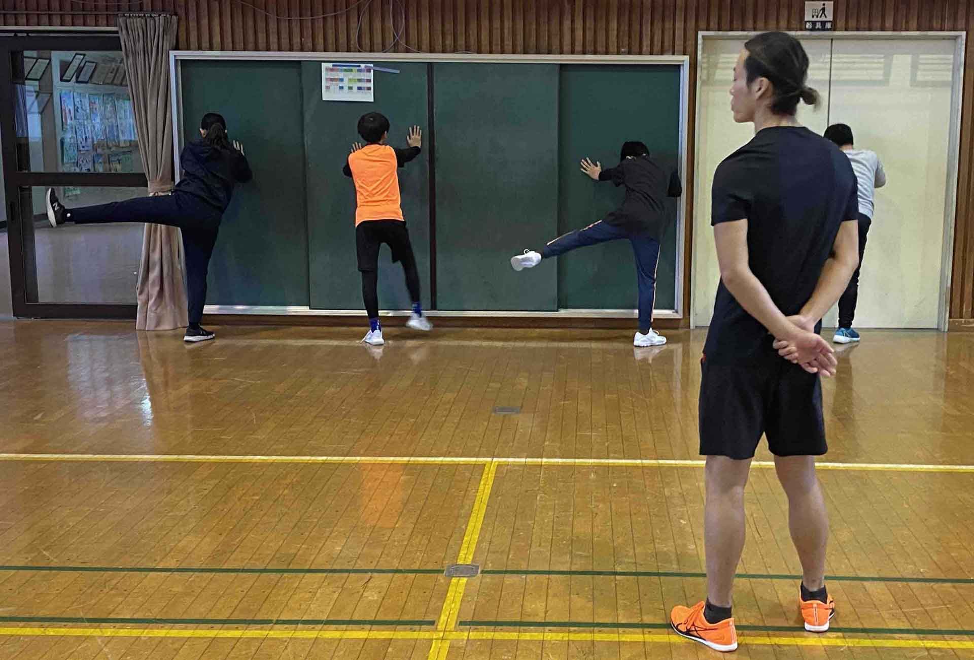 実技の時間は全員体育館の壁に整列して「股関節」のストレッチを行いました。股関節を使って足を前後に振っていきます。