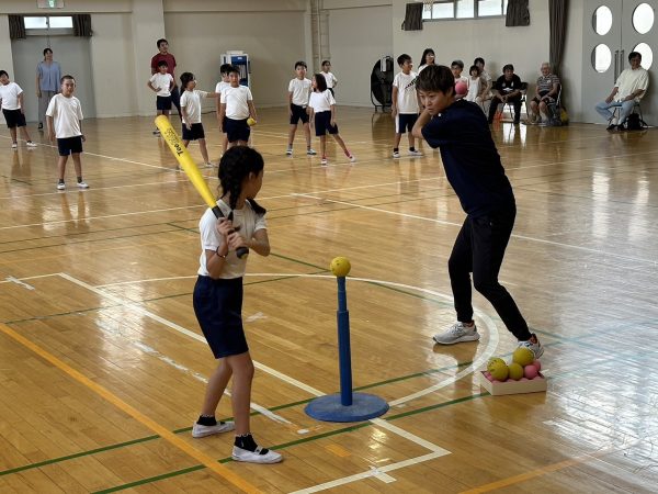 後半ではバッティングにも挑戦です!はじめは空振りしてしまう児童も、神山さんのアドバイスでボールが飛んだ時には大喜び!普段運動が苦手な児童も積極的に取り組む姿に、先生方も驚かれていました。
