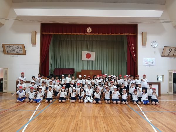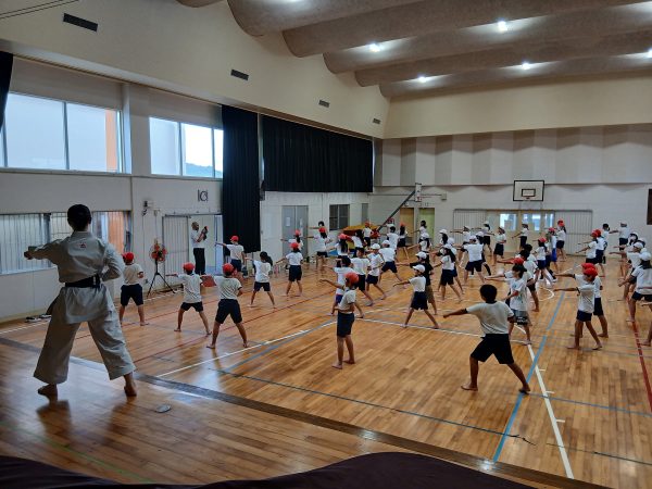声を出して全身を使い、最後は全員で空手の型を実践。笑顔と賑やかな声で始まった授業も、次第に力強い表情と気合の入った声で、拳を突き出す児童たちでした。