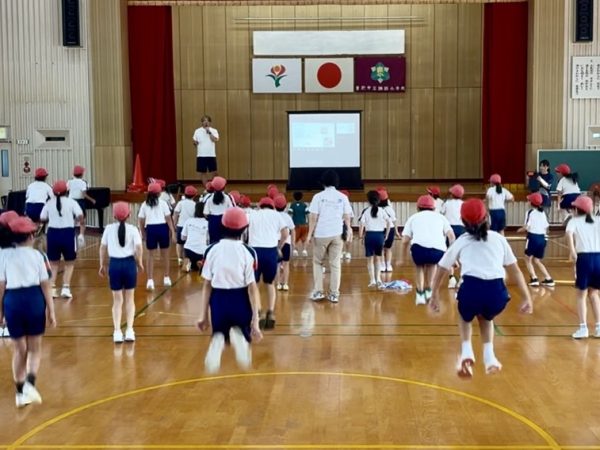 講話の最後に全員ホイッスルに合わせてジャンプをする運動をしました。「速く走るためにはジャンプの力も大事。走る前に準備運動でジャンプをするだけで体が軽くなるからこれからもやってみよう!」