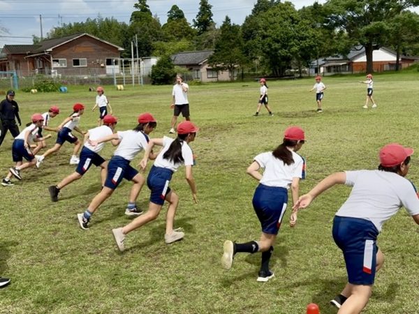 授業の後半は5·6年生がグラウンドに出て早く走るコツやスタートのコツ、そしてバトンパスを学びます。運動会間近の児童たちは稲垣さんからの指導を一生懸命に取り組んでいました。