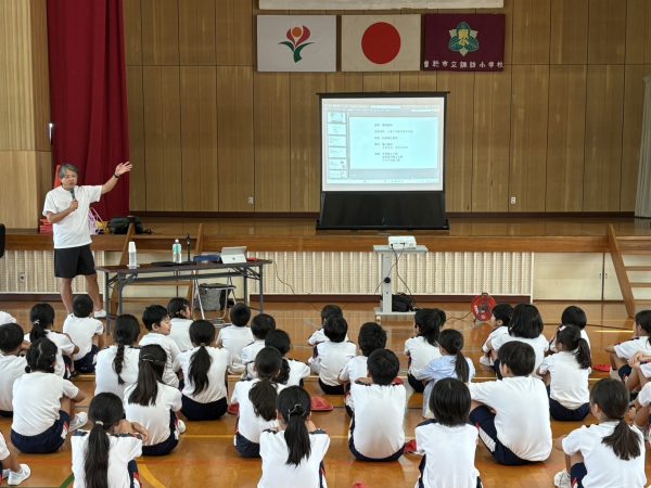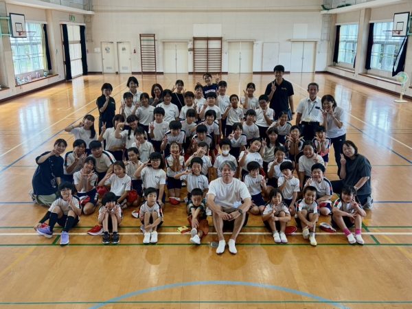 元気に体育館に集まった1年生から6年生まで約50名。稲垣さんが世界陸上に2回出場したと聞いて、テレビで世界陸上の中継を見ている児童たちは目を輝かせて話を聞いていました。小学生の時は電車が好きで四国や九州をひとりで回るような子供だったけれど、中学から陸上をやって日本代表になれたという稲垣さん。何かのきっかけで人生が変わることがある。だから何か好きなことを見つけて、続けてみよう!というメッセージを児童たちに伝えていました。