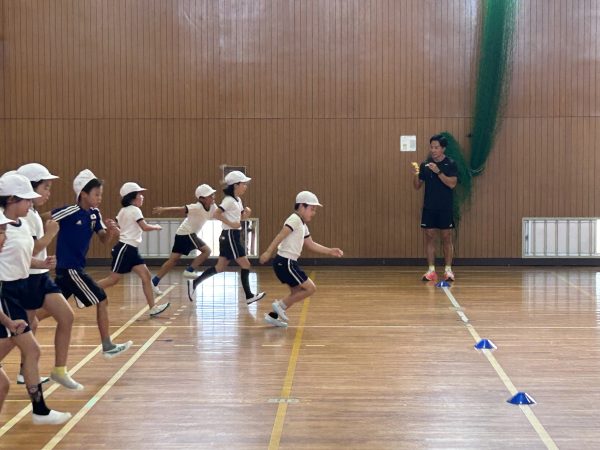 少しずつステップを踏んで授業が進んでいき、児童たちは教えてもらったことを意識しながら笑顔で一生懸命取り組みます。最後に速い走り方の“3つのポイント”がまとめられた相山選手特製カードを一人一人に手渡し授業は終了しました。