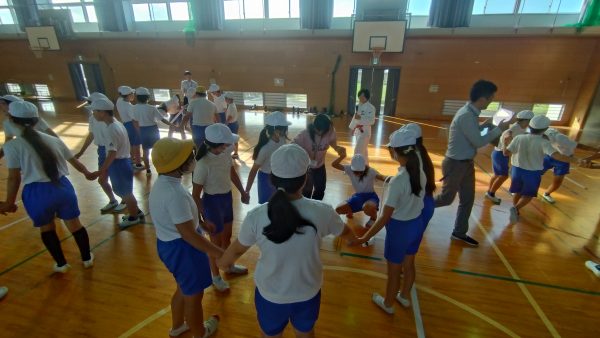 特徴的な屋根瓦、時計台のある素敵な校舎、25年前に地域の学校が統合されたとても綺麗な豊里小学校。今回は6年生約30名が参加しました。授業前の休み時間に、どうしても参加したかった2年生が集まり、サインコールが起こっていました!