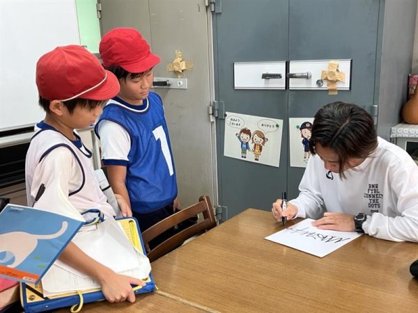 簡単な動作でも、複数のことが合わさると難しくなると実感した児童に、岩本さんは頭で考えるのではなく、体が覚えてしまうくらい練習すると簡単になるとアドバイスし、上達に必要な「習慣化」のコツを教えていました!