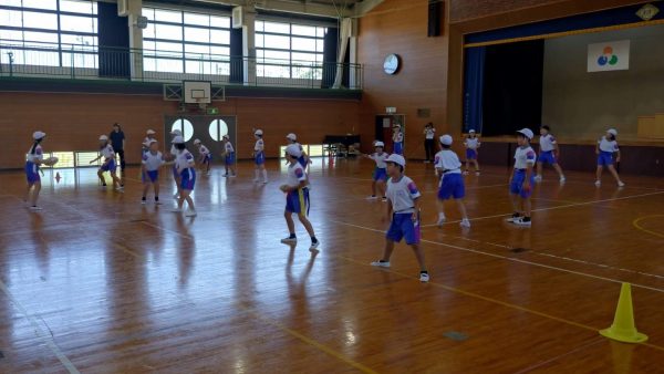 ラグビーボールを使ってのパスの練習、蹴る練習など一通りした後、タグラグビーを行いました。最初から突っ込んでいく人、様子を見ながら行く人、人の後ろに隠れて前の人が行った隙に突破していく人、このスポーツは本当に性格が出ます。何回かやるうちに、作戦を変え突破する方法を各々考えていました。初めてのラグビーボール、タグラグビーにみんな楽しそうに取り組んでいました!