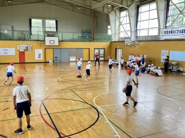 実技では「パッ、トントン、クルッ」とボールを遠くへ投げるコツをレクチャーした後、バットを使わずに、投げる形式でのベースボール型ゲームを実施。