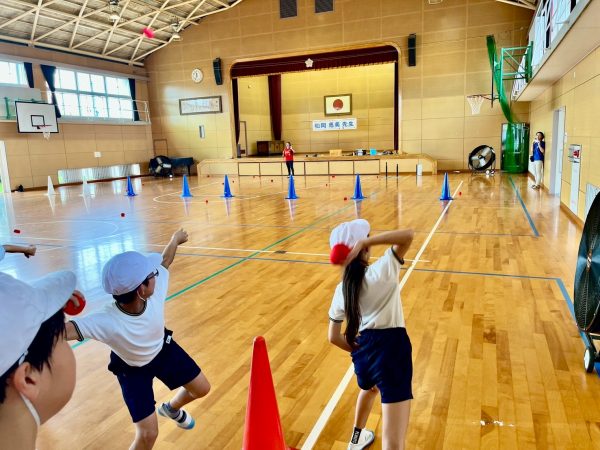 実技では6列に並び、順番に遠くのコーンめがけてボールを投げました。力いっぱい投げながらも笑顔で楽しみ、汗をかきながらも「楽しい」と声を上げていました。