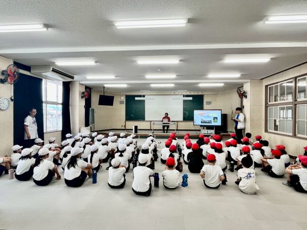 視聴覚室で講話からのスタートです。松岡さんが、自身の経験や努力の大切さ、感謝の心、前向きな言葉の重要性を児童たちに伝え、強みを見つける考え方や目標達成の工夫について講話しました。