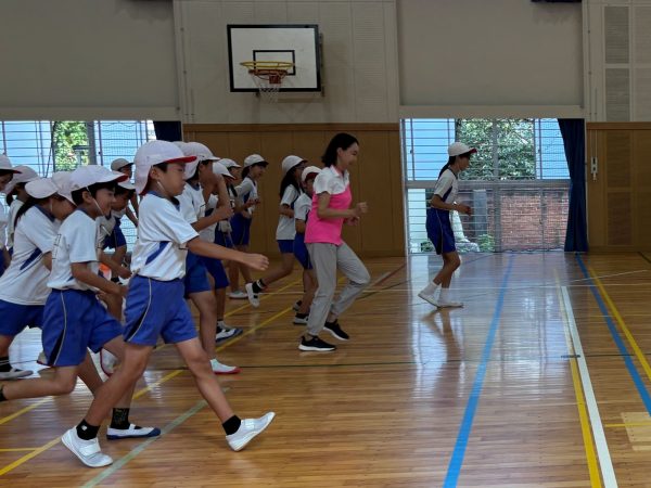 千葉さんが簡単な自己紹介をしたあと、走るのが苦手と思っている児童も半数程いることを知り、「今までよりちょっとだけ走ることが気持ちいってなってくれたら嬉しいです」と伝え、授業スタート。準備運動の後、「走りの基本は歩き」と伝え、児童たちも「イチ、ニ」とテンポよく歩くことからやってみます。