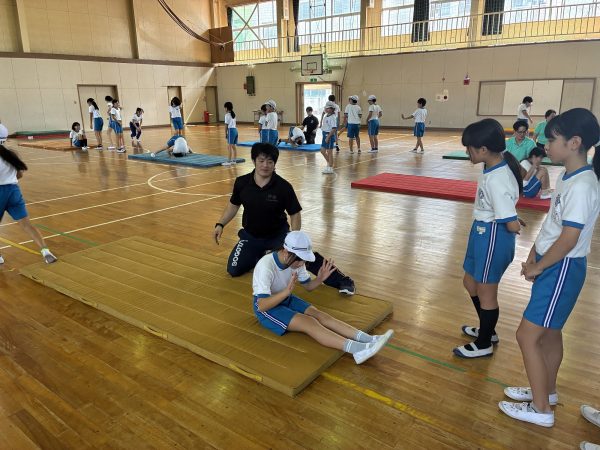 トレーニングでは、腹筋、背筋、腕立て伏せに取り組みました。マット運動では、仲里さんの見本を見ながら、後転や逆立ちに挑戦し、児童たちは真剣な眼差しで取り組んでいました。