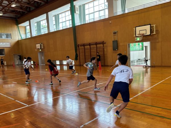 ラグビーのパスやキックを教えたあとは、チームで作戦会議の時間を持ったりと児童同士のコミュニケーションの時間も度々設けながらゲームも行いました。