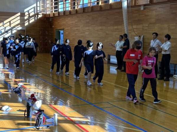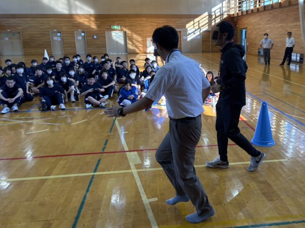 授業の締めくくりに先生方にも体験してもらいました!児童生徒たちは歩くだけの体験でしたが、先生方には少し走ってもらいます。一生懸命挑戦する先生をみんなで応援!!