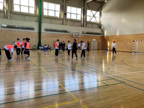 今回の授業は実技から。男子生徒が準備運動やボールの簡単な「止めて」「蹴る」を練習して最後は試合!