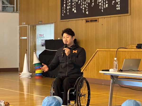 戸田さんは突然の障がいを負った経験とパラスポーツとの出会いを通じて前向きさを取り戻したことを語り、児童たちはそのお話しに真剣に耳を傾けました。