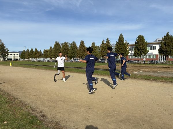 池田選手は、地面から足を話すときの感覚を生徒に伝えるため、ジャンプトレーニングやスタートダッシュの練習を丁寧に生徒たちに教えました。