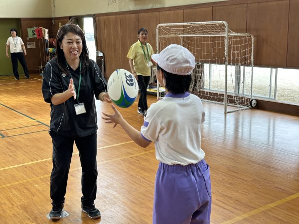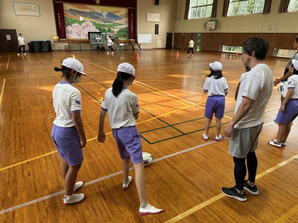 そして、楕円形のボールの感触をつかんだり、ラグビーボールを持ってのリレーやパスを教えてもらい、みんな元気いっぱい走り切りました!笑いがいっぱいの楽しい授業になりました!