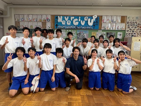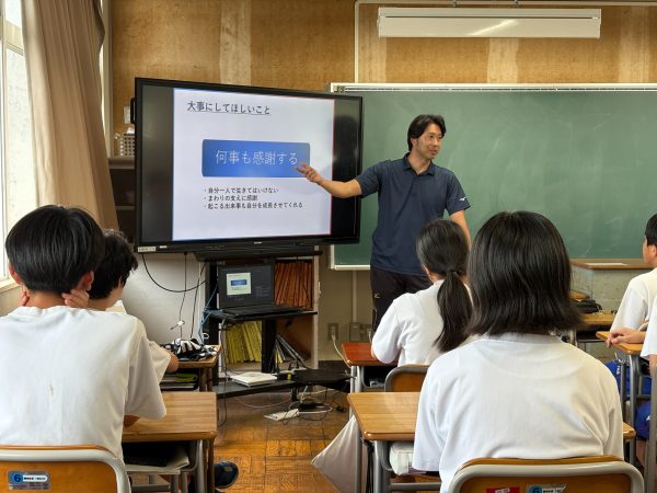 講話の時間ではプロの世界で壁に直面しながらも強い想いを持って努力し続けた経験をお話しいただきました。転職をして、全く知らない仕事をしないといけない時に「選手時代に努力した糧があるから、辛い時でも努力しようとする姿勢になる。努力してきた事が自分自身の人としてのレベルを上げてくれる。」と語り、日々の積み重ねや、夢・目標に向かって行動する過程を大切にして欲しいと伝えられ特別授業は終了しました。
