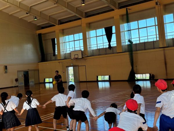 4~6年生約90名がきちんと整列している中、中払さんの講話が始まるかと思いきや、「ミニゲームできそう!」と急遽児童たちに横1列に並んでもらい、中払さんがボールから手を放している時だけ動いてOKという“だるまさんがころんだ”に類似したミニゲームをしました。