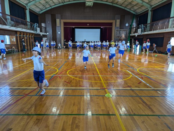 力の入れ方や姿勢を確認しながら、「速く走るためには下半身の使い方がポイントになる」と山岸さんがアドバイスすると、児童たちは一生懸命に体の動きを確かめていました。