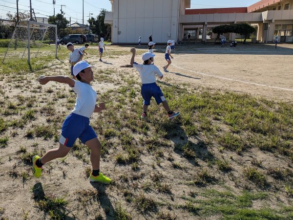 「股関節の動きをうまく使うと、力を伝えることができる」との説明を受け、児童たちは試行錯誤しながら投げ方を工夫していました。