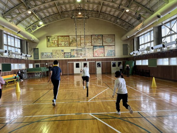 実技の授業では「早く走る方法を学ぶ」をテーマに体育館で様々な動きにチャレンジしていきます。