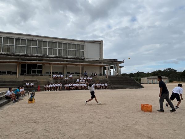 早速ソフトボールを使って、ボールの投げ方やキャッチ、バットスイングのしかたを生徒たちに説明します。