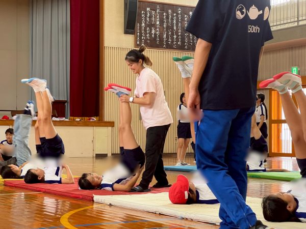 授業前半は、倒立の披露から始まり、準備運動や柔軟を行い、児童たちは柔軟運動に悲鳴を上げながらも楽しく体を動かしました。