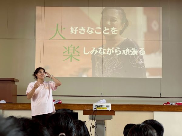 講話では土橋さんが自身の体操選手としての経験や苦労、成長の過程を語り、児童に自分で考え挑戦することの大切さや好きなことに全力で取り組む意義を伝えました。