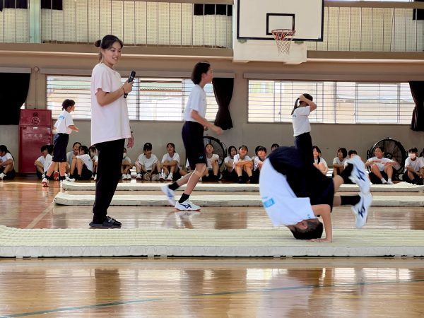授業前半は、1年生の1クラスを担当し、倒立の披露から始まり、準備運動や柔軟を行い、生徒たちは楽しく体を動かしました。貴重な機会ということで同学年の別クラスの生徒たちも見学参加していました。