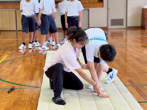 実技後半では、前転や開脚前転、後転、側転の練習を行い、土橋さんのアドバイスで生徒たちの技術が向上していく様子が伺えました。見学の生徒たちの中からも土橋選手のアドバイスを聞き、自主的に練習する姿が見られました!