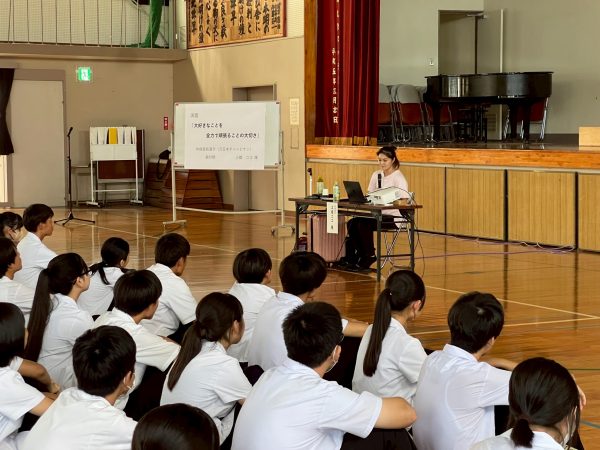 講話では土橋さんが自身の体操選手としての経験や苦労、成長の過程を語り、生徒たちに自分で考え挑戦することの大切さや好きなことに全力で取り組む意義を伝えました。