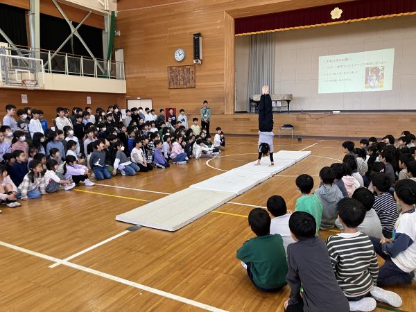 全校児童を前に披露した模範演技では、軽やかな回転と着地、指先まで美しい姿に大歓声!