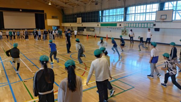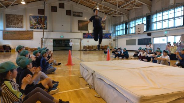 決められた場所から端まで、立ち幅跳びで何歩で行けるか?の挑戦!児童の平均は9歩程度。足の速い児童で8歩。そんな中、佐久間さんは6歩で行くことが出来ましたその後もジャンプ力や足の速くなる練習をし、一人ずつ跳んでみました。最初はぎこちなかったジャンプも練習を重ねるにつれ、みるみる内に上達!時間が少なく、まだ跳びたい児童たちも少し残念がっていました。