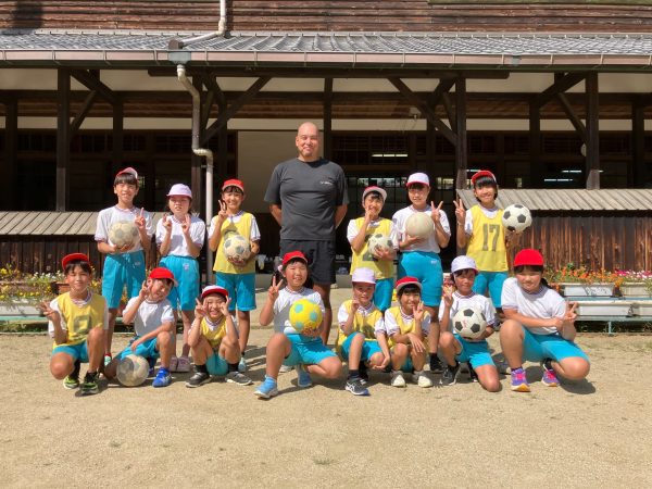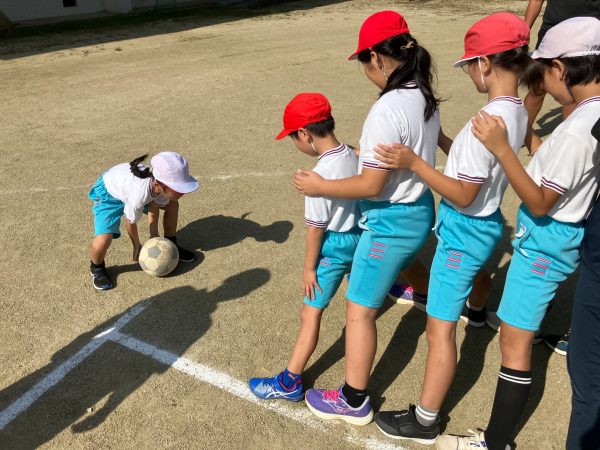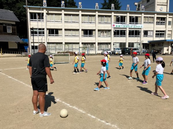 サッカーボールをどれだけ遠くに飛ばせるかの見本を紀氏さんが見せた際に、予想を上回る程遠くに飛んだボールに児童全員から驚きの声が上がっていました!