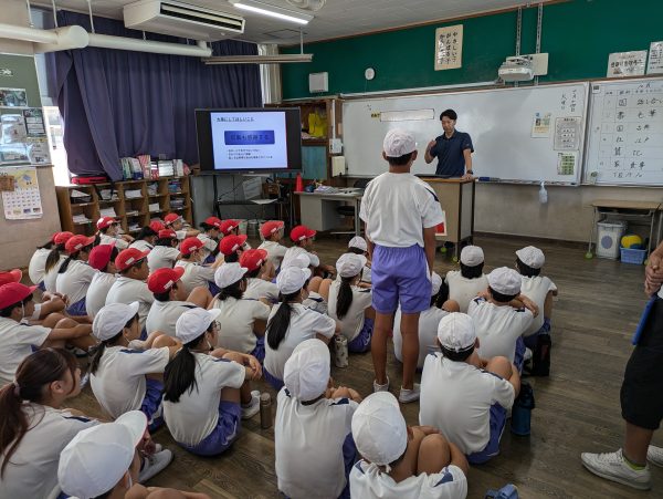 自身の野球人生を例に、努力を続けることの意味や、自分で考えて行動する大切さを伝え、児童たちは真剣な表情で話を聞いていました。
