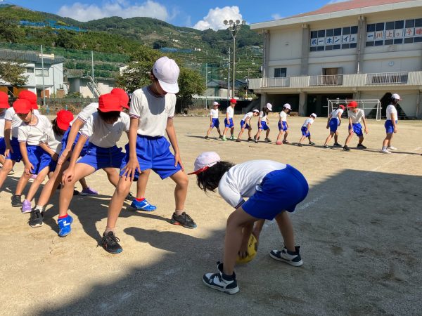 実技の時間ではウォーミングアップのじゃんけん五連勝ゲームや、チームワークやタイム短縮の為にどうしたら良いかを考える力を養うサッカーボール股下通しでチーム対抗戦を行いました!