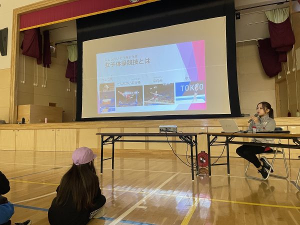 最初の講話では、体操の競技内容や、男子・女子で異なる種目について説明。