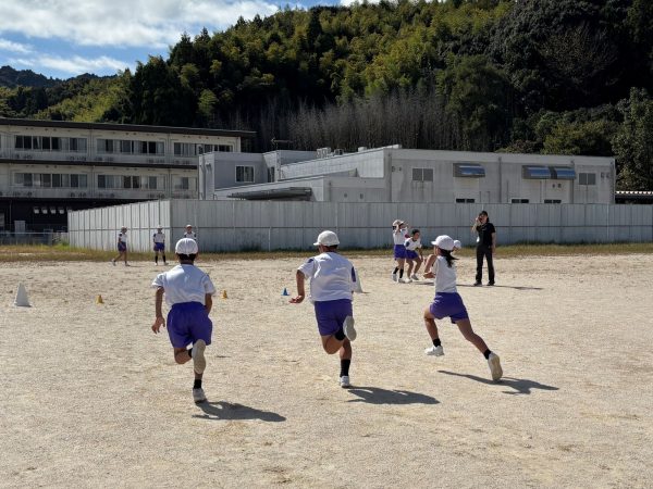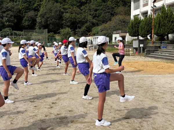 実技の授業では、今日児童たちが初めてやるという5分間走にチャレンジします。そのための準備運動や走り方の姿勢のポイントを湯田さんから学びました。