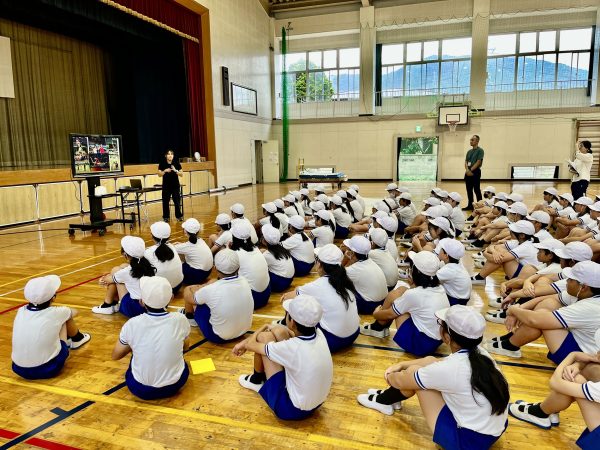 大島さんが体操を始めたきっかけや努力の経験を語り、怪我や困難を乗り越える話を通して、運動で体を鍛え、柔軟性を身につける大切さや挑戦する心を伝えました。