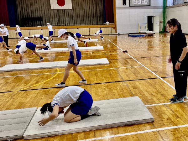 希望者のみで行われた実技では、まずストレッチや柔軟体操からスタート。カタカナの「ヒ」の字の形で転がるなど、多様な柔軟運動に挑戦し、互いに応援しながら技に挑みました。