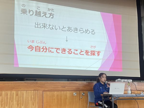 児童たちは「どんな練習をしていたんですか?」「つらい時はどうしていましたか?」など時間が足りなくなるほど積極的に質問し、畠田さんは自分の経験を交えて丁寧に答えていました。