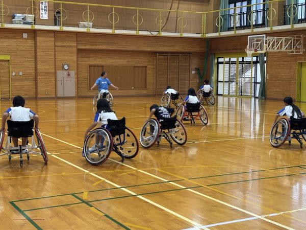 まずは、車いすの扱い方を教えてもらいます。まっすぐ進むこと、後ろに進んだり、左右に曲がったり、慣れないうちは緊張しながら学んでいきます。車いすで鬼ごっこをしたりしながらだんだんと慣れてきました。