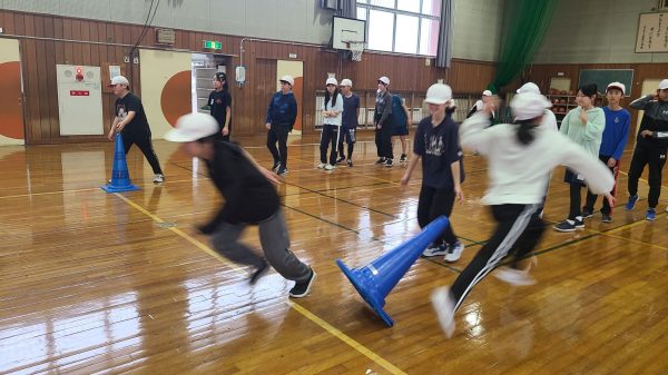 スタートで飛び出す練習をした成果で競います。体育館は白熱!